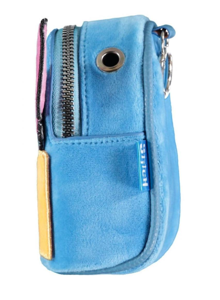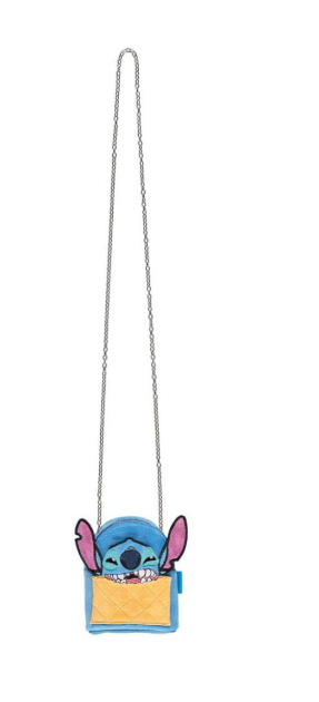 Este microbolso exclusivo con licencia oficial de Disney presenta un diseño adorable de Stitch mordiendo una piña. Confeccionado en un material suave al tacto tipo terciopelo, el bolso es de color azul con detalles en amarillo en la parte frontal que simulan la forma de una piña. El detalle más encantador son las orejas de Stitch en 3D que sobresalen en tonos rosa y negro, dándole vida al personaje.